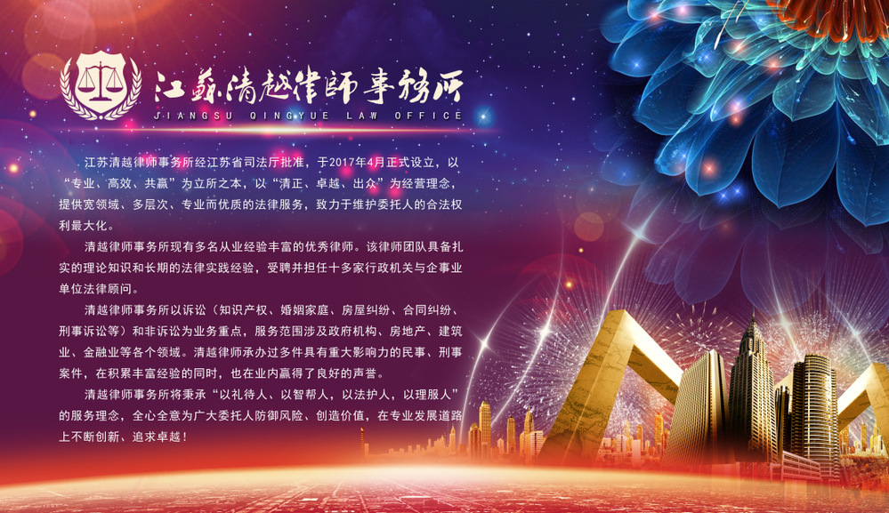 江苏清越律师事务所经江苏省司法厅批准,于2017年4月正式设立,以“专业、高效、共赢”为立所之本,以“清正、卓越、出众”为经营理念,提供宽领域、多层次、专业而优质的法律服务,致力于维护委托人的合法权利最大化。